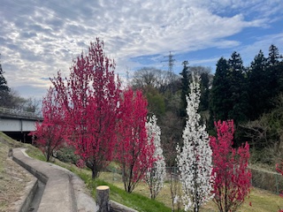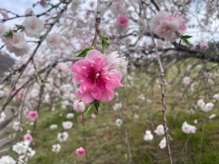 浅川のループ橋手前に今花桃が咲き誇っています。